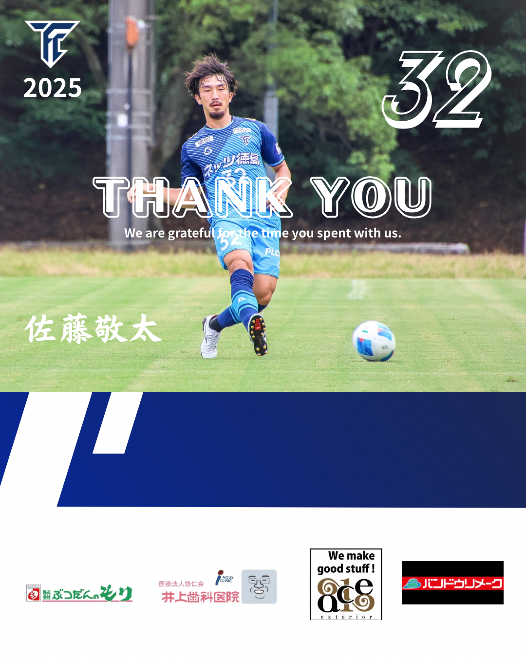 【佐藤敬太選手退団のお知らせ】 トップチーム 2025/12/16 佐藤敬太選手は契約満了に伴い2026シーズンの契約を更新しないことになりましたのでお知らせします。 🔵選手コメント🔵 FC徳島に関わる全ての皆様、1年間ありがとうございました! このチームでサッカーができて本当に良かったです!サッカーと仕事の両立ができたのも美摩病院の皆様が優しく、丁寧に仕事を教えてくれたおかげです!短い間でしたが本当にお世話になりました。