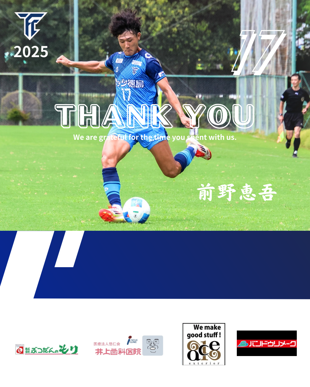前野恵吾選手は契約満了に伴い2026シーズンの契約を更新しないことになりましたのでお知らせします。